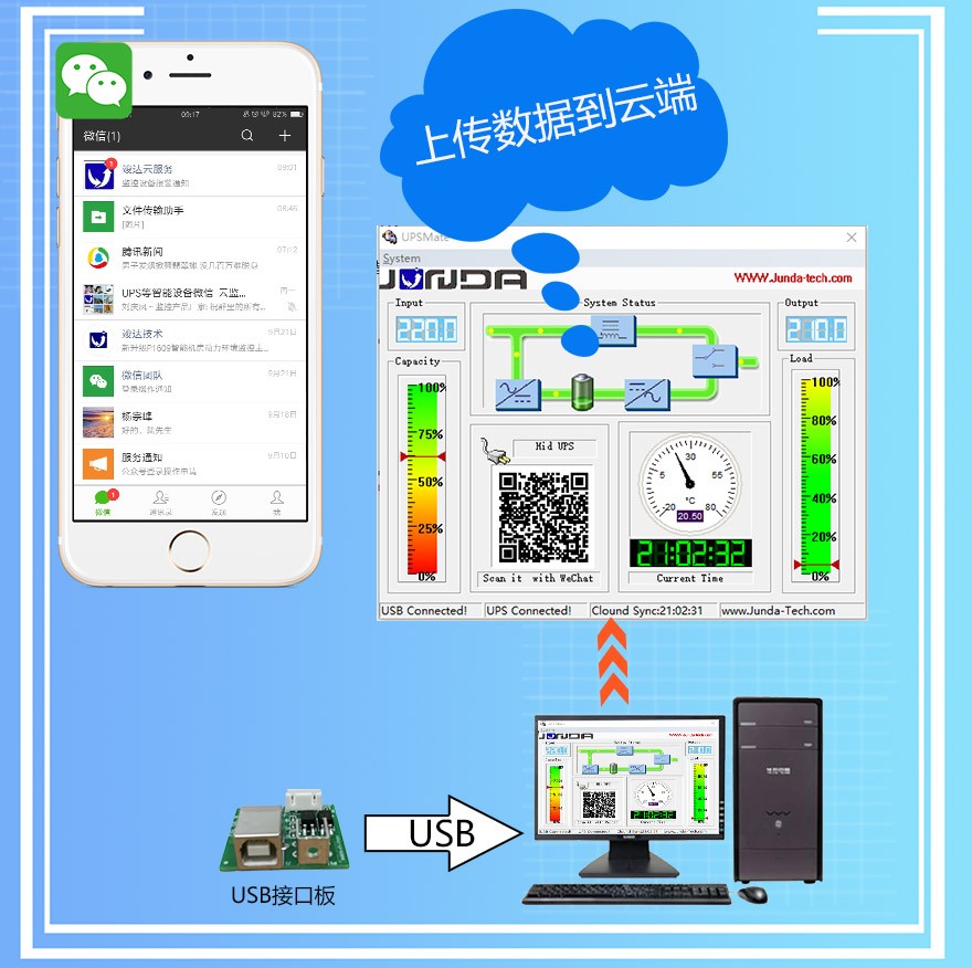 UPS Mate微信云监控监控方案UPS Mate微信云解决方案,基于客户UPS的USB接口,在即插即用的基础上, 快速的将设备接入云端..为客户提供手机监控,微信报警功能。系统示意图:界面基本构成:供电危机处理:事件时间延迟触发:微信扫码,一键关注:软件品牌专属定制: