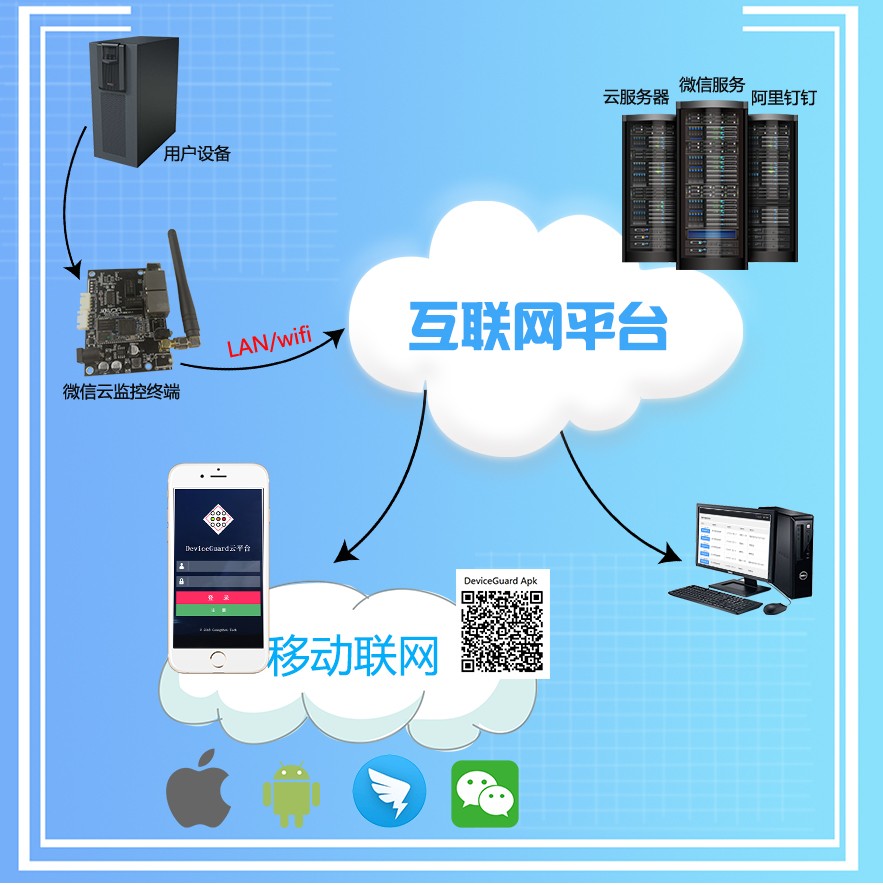 Device Guard云监控方案是指微信云监控卡,基于客户现有的RS232或RS485接口,可以快速的将设备接入云端,为客户提供手机监控,微信报警和云端集中管理等功能。