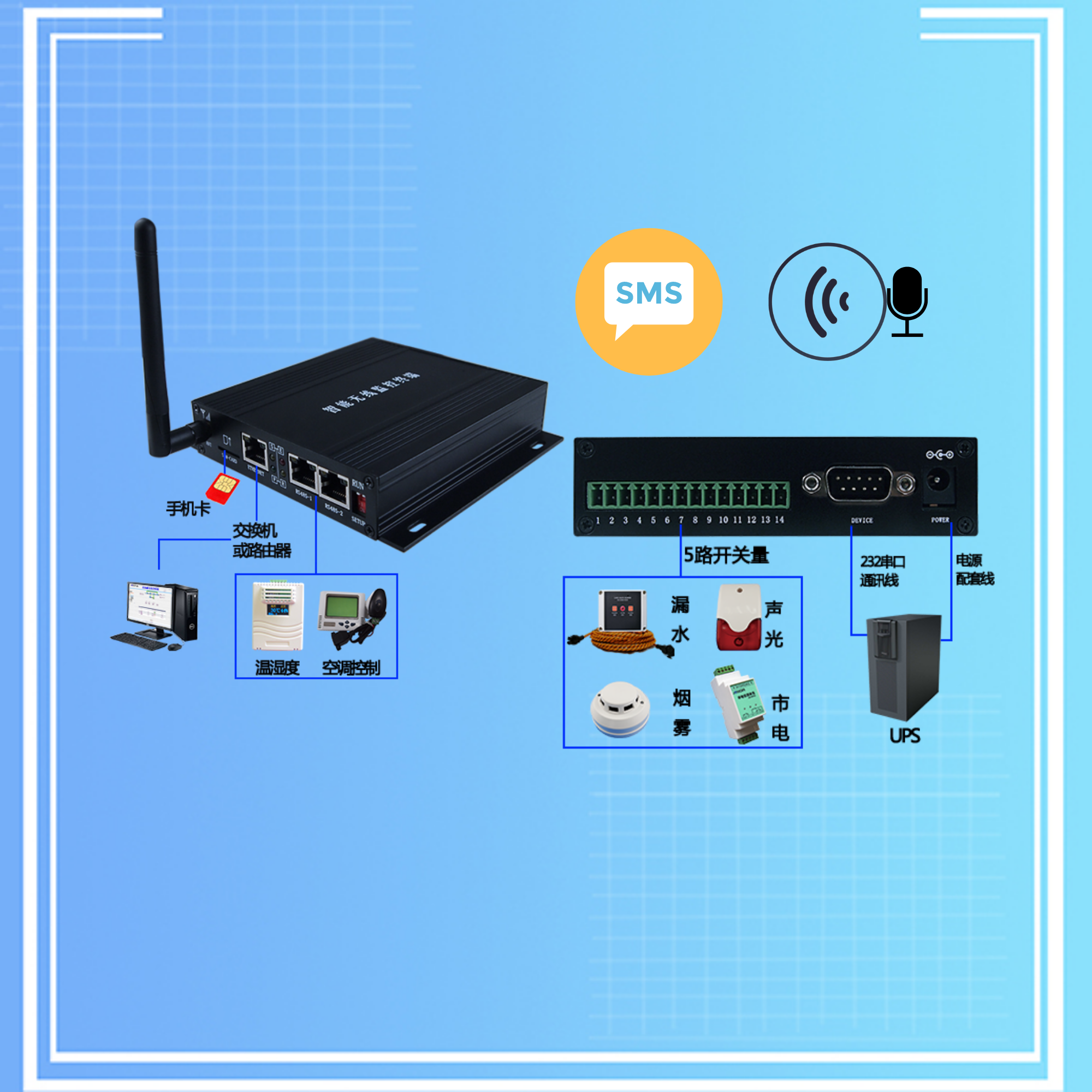 2. 设备支持监控1路UPS电源、5路开关量检测、多达8路温湿度检测模块,实现对机房环境温度、湿度的实时监测。